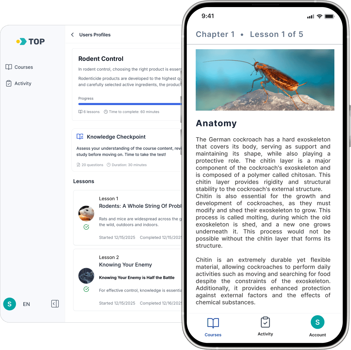 Top helps pest control businesses ensure their tehncicians stay sharp and up to standard. Each user can move through modules covering technical pest control, safety, customer care, marketing and leadership, building well-rounded, field-ready professionals.